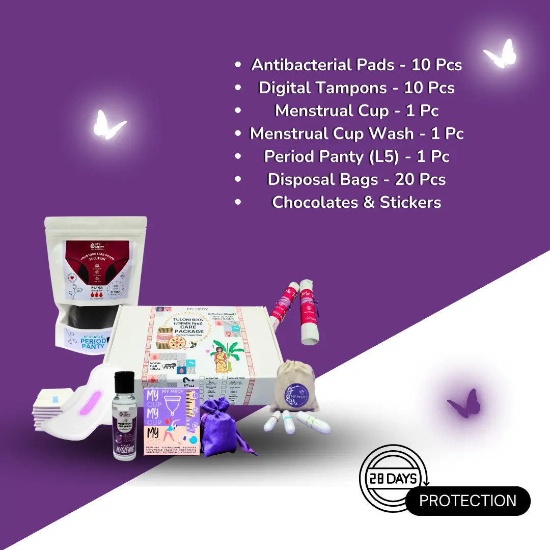 Our Tuloni Biya Care Package includes a variety of options to match your preferences and needs. Whether you’re trying out the menstrual cup for the first time or sticking with traditional pads, we’ve included everything to help you find what works best for you.
