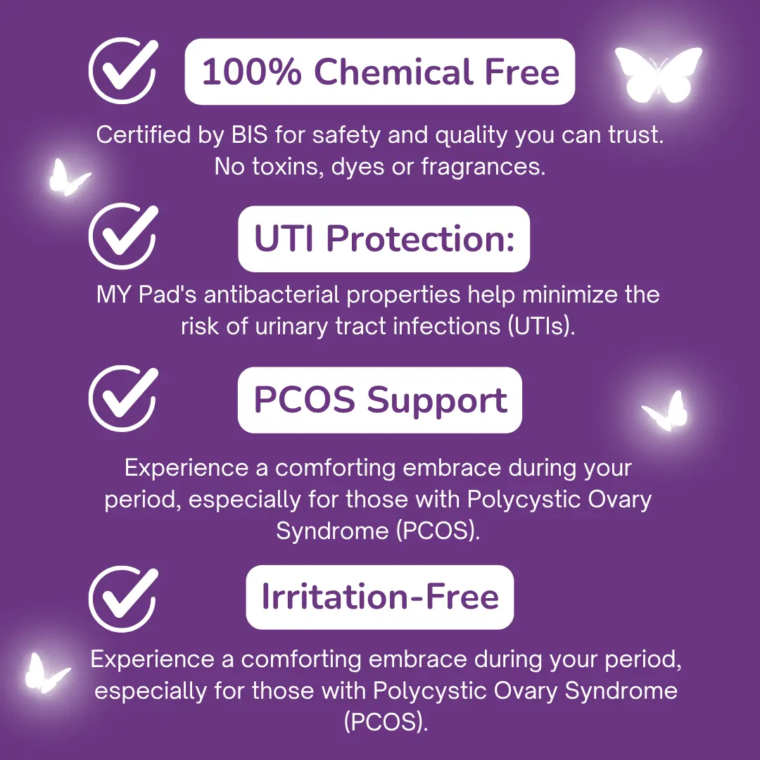 - UTI Protection: MY Pad's antibacterial properties help minimize the risk of urinary tract infections (UTIs).