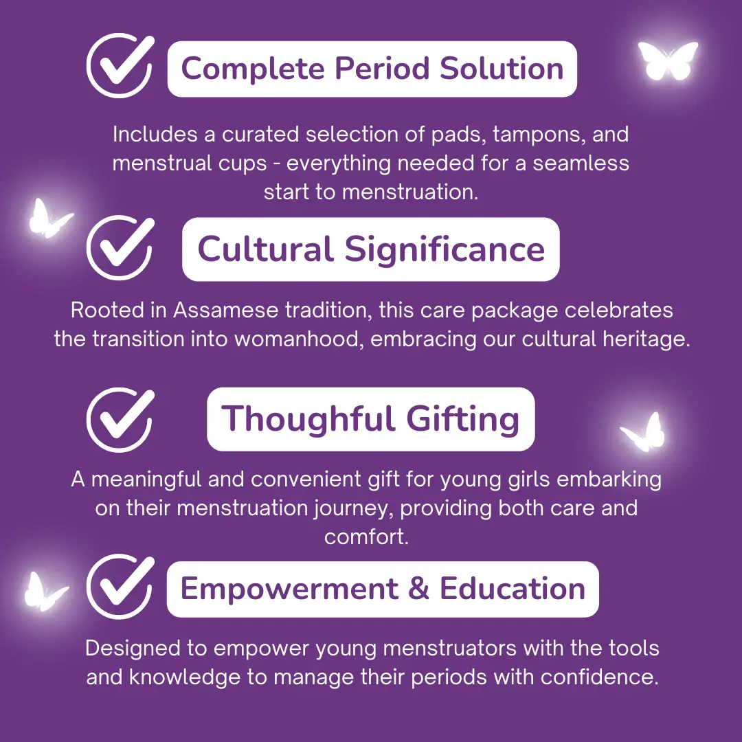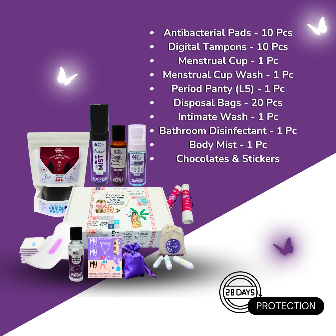 Our Tuloni Biya Care Package includes a variety of options to match your preferences and needs. Whether you’re trying out the menstrual cup for the first time or sticking with traditional pads, we’ve included everything to help you find what works best for you.